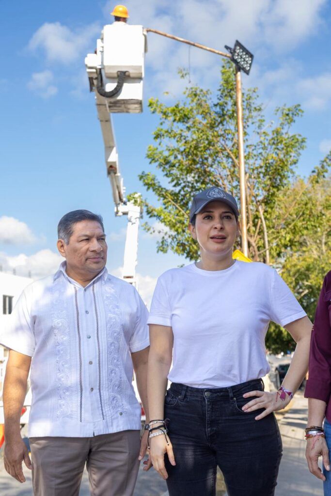 Acompañada por la secretaria de Servicios Públicos, Julieta Martín Azueta, y el alcalde Gilberto Gómez Martínez, la alcaldesa recorrió la calzada Puerto Maya, donde personal de Alumbrado Público llevó a cabo trabajos de mantenimiento y sustitución de luminarias.