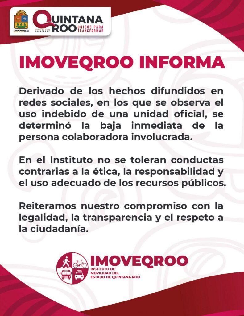 El Imoveqroo subrayó que la decisión de suspender al operador responde a su política de cero tolerancia ante conductas que vulneren la seguridad, integridad o derechos de los usuarios de transporte público.